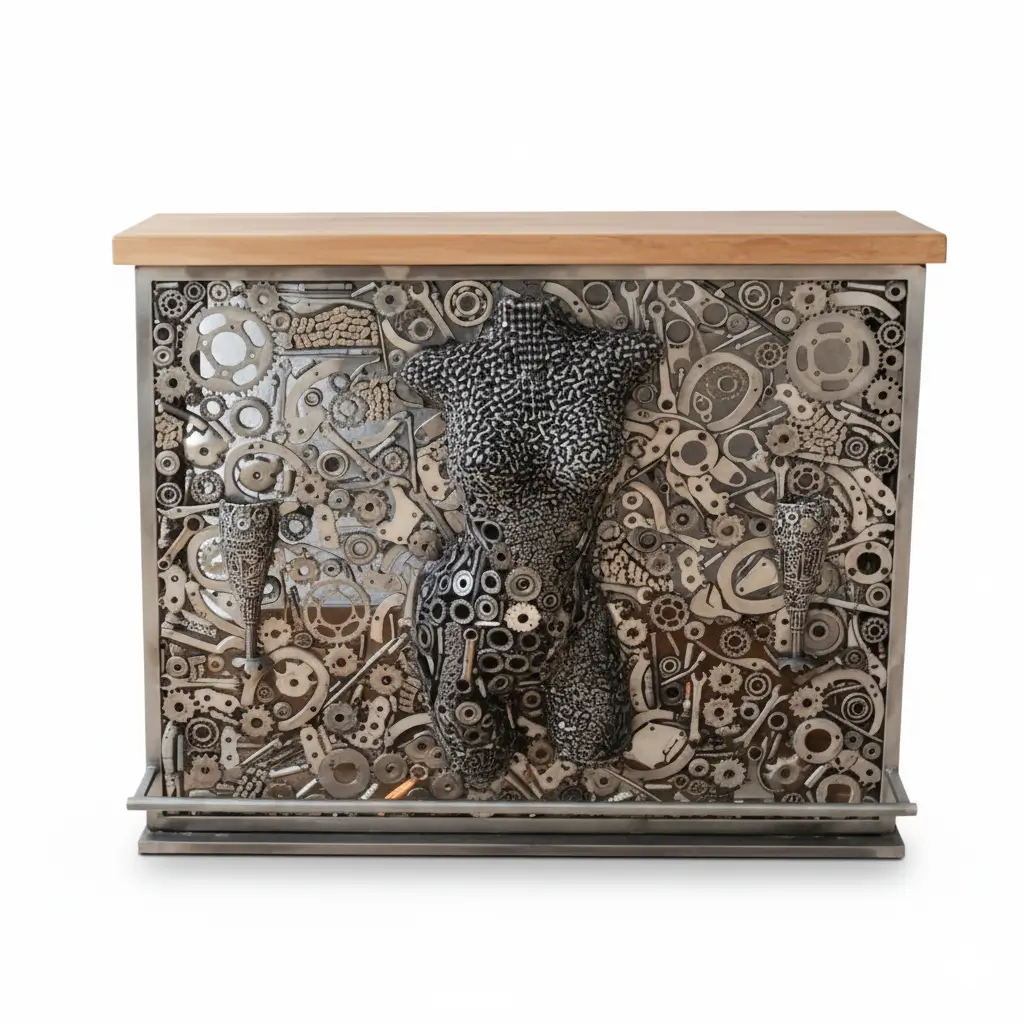 Cette console spectaculaire mêle art et fonctionnalité. Sa façade est composée d’un assemblage unique de pièces mécaniques formant une sculpture détaillée de corps humain. Avec son plateau en bois massif et sa structure métallisée, elle devient un véritable point focal dans un salon, un hall d’entrée ou un espace showroom. Une pièce d’art exclusive pour les amateurs de design audacieux.