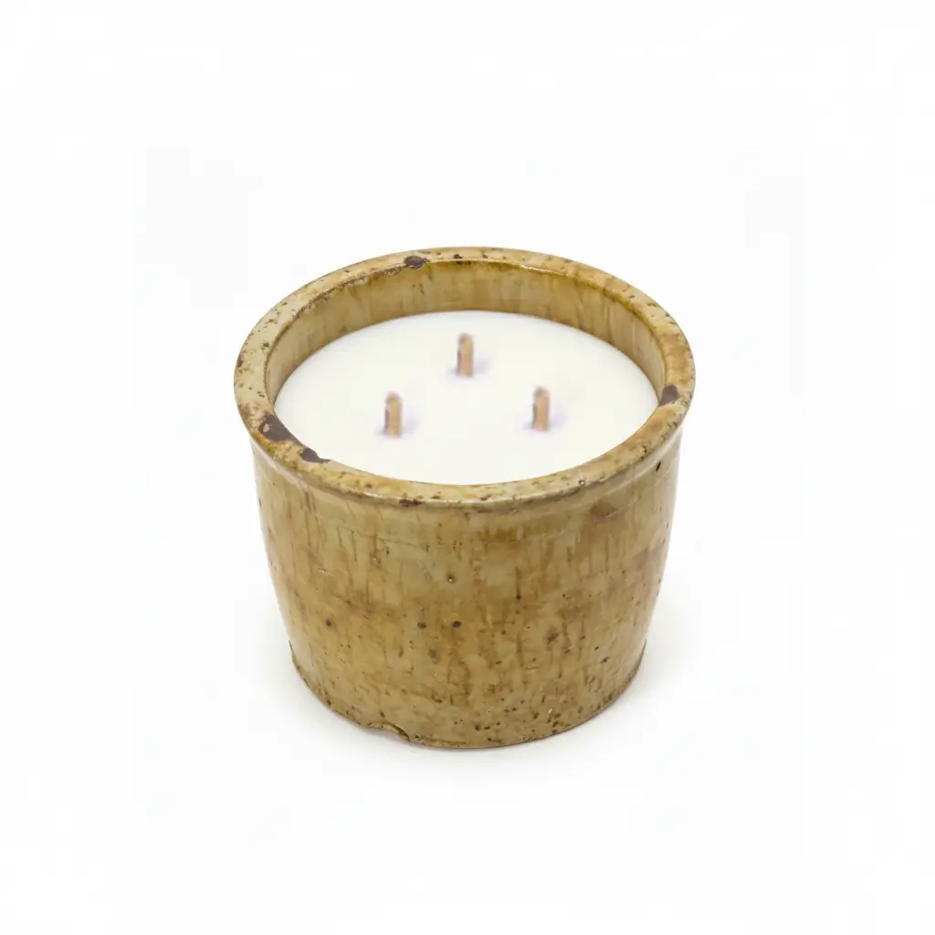 Bougie parfumée coulée dans un pot artisanal en céramique rustique. Ses multiples mèches assurent une combustion uniforme et une atmosphère chaleureuse dans votre intérieur.